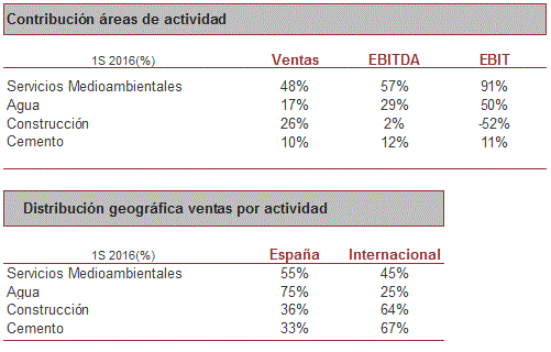 Los resultados de 1S16 se han situado ligeramente por debajo de nuestras estimaciones en ventas, pero en línea a nivel EBITDA. Observamos unas ventas descendiendo en torno al -9% en 1S16, lastradas principalmente por el mal comportamiento de la división de Construcción (1S16 -23%, debido a la continua contracción de la inversión pública en infraestructuras a nivel nacional) y por ladepreciación de la libra esterlina. Así mismo, observamos como las ventas de sus dos divisiones core se contraen ligeramente: Servicios Medioambientales (-4%) y Aguas (-4%).