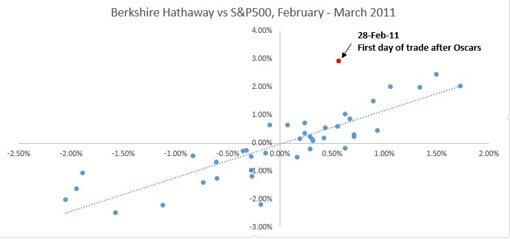 El lunes posterior a que Anne Hathawat ganase el Oscar por “Los Miserables” en 2011, las acciones de Berkshire Hathaway Inc. Subieron un 2.94%, mientras el S&P500 solo subió un 0.56%. El viernes anterior, las acciones habían subido un 2.02%, el doble que el mercado. Y el martes 1 de marzo, cayeron un -2.48% mientras el mercado bajaba solamente un -1.57%. El valor de beta para Berkshire es de 0.8, lo que significa que en promedio es menos volátil que el mercado. El grafico siguiente muestra como el 28 de Febrero fue una clara anomalía en el comportamiento de la acción comparado con el resto de días de Febrero y Marzo de dicho año.