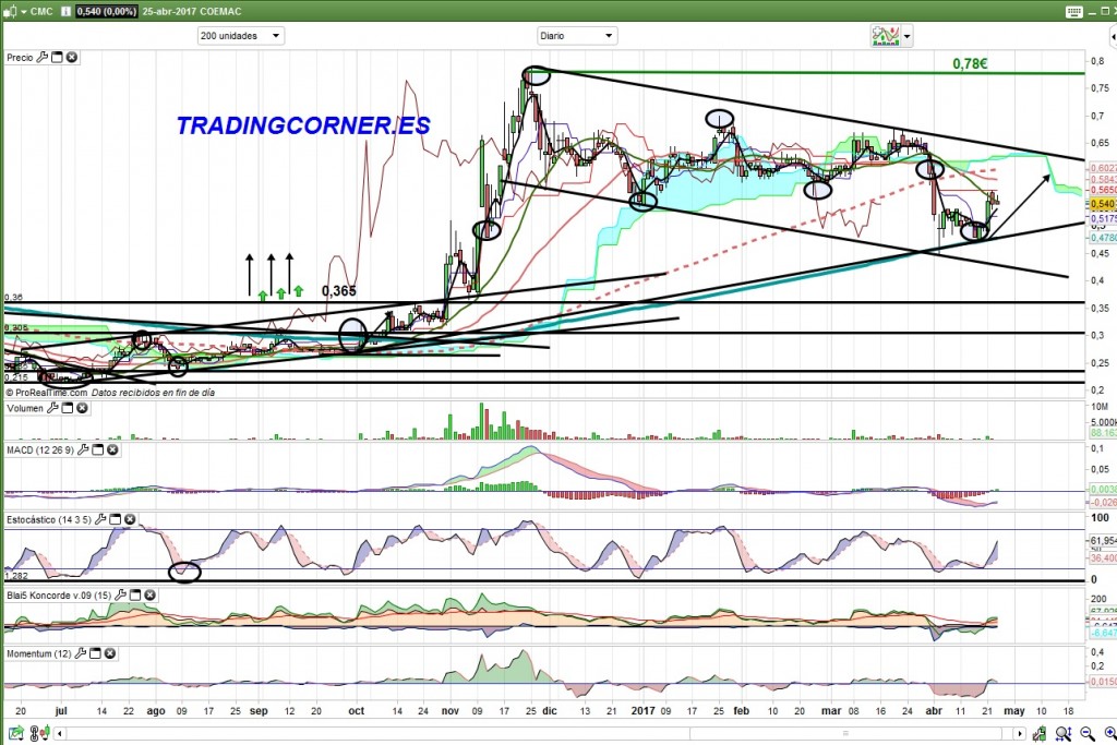 “El grupo COEMAC se encuentra actualmente inmerso en el proceso de renegociación y extensión de vencimiento de las líneas de descuento, avales y confirming (en adelante, “líneas DAC”) que vencen a finales de abril de 2017, por lo que en estos momentos mantiene negociaciones con las principales entidades financieras de relación. Sujeto a la renovación y extensión de las citadas líneas DAC, el grupo mantiene negociaciones sustancialmente avanzadas para la formalización de una nueva línea de financiación que permitirá la adecuada ejecución de su plan estratégico en el corto y medio plazo”. (Esto sería inminente, lo que supone un dato muy positivo para los principales analistas del mercado).