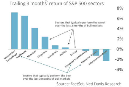 Un análisis realizado por Ned Davis Research ha estudiado el comportamiento de los 10 mayores sectores del S&P 500 desde 1970. Bien, pues durante los últimos tres meses de un mercado alcista, los sectores que mejor comportamiento han tenido fueron los de consumo discrecional, consumo básico y cuidados de la salud. Como vemos en el gráfico adjunto, dos de esos tres sectores están situados actualmente en el puesto 8 y 9 de rentabilidad.