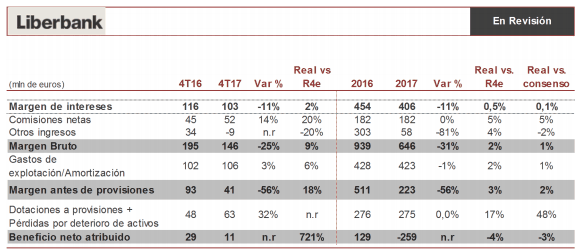► Márgenes el margen de intereses crece un 2,9% trimestral (vs +1% R4e y +0,7% 3T17/2T17) y mejora el MI/ATM hasta 1,12% en 4T17 (vs 1,01% 3T17) apoyado por el descenso de los activos en un contexto de estabilidad tanto del rendimiento del activo como del coste del pasivo. Las comisiones netas (+28% i.t) recogen 9 mln de euros de comisiones no recurrentes asociadas a acuerdos de seguros y de gestión de activos inmobiliarios. Eliminando este efecto crecen +7,5% 4T17/3T17 (en línea con R4e y consenso) y +1,4% i.a 2017. Para 2018 esperan que crezcan apoyadas por la contribución del acuerdo alcanzado con EVO Payments, la evolución de los activos fuera de balance y el negocio de seguros. ROF en 4T17 (30 mln de euros) más elevados vs 3T17 (5 mln de euros) por reorganización de carteras, sin embargo en el cómputo anual los ROF disminuyen 74%.