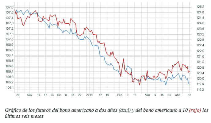La escalada del tipo de interés del bono a dos años del Tesoro americano desde los niveles de 1,25% a los que estaba el pasado septiembre, hace poco más de seis meses, hasta el actual 2,35% es impresionante, tal y como muestra la línea azul del gráfico que adjuntamos. En ese gráfico se ve la caída continuada estos últimos meses del precio de los futuros del bono a dos años (línea azul), lo que nos indica una subida correlativa e igualmente continuada de su tipo de interés, ya que el precio y el tipo de interés de los bonos se mueven de forma inversa. De hecho, como antes decíamos, el tipo de interés del bono a dos años cerró el pasado viernes en máximos del año, es decir, por encima de los niveles del pasado febrero, tal y como muestra el gráfico adjunto, ya que el precio de los futuros está ahora más bajo que en febrero.