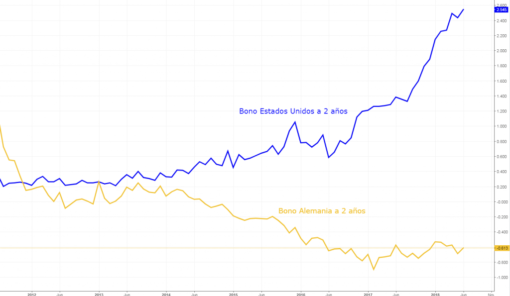 Desde 2012 el Bono a 2 años de Estados Unidos ha ido incrementando su rentabilidad, en especial durante el último año y medio. Paralelamente, el bono Alemán a 2 años ha ido reduciendo su rentabilidad manteniéndose negativa durante la mayor parte del tiempo. Actualmente, el bono Alemán a 2 años renta un -0,616% mientras el bono a 2 años de Estados Unidos un 2,54%. Una diferencia del 3,15%.