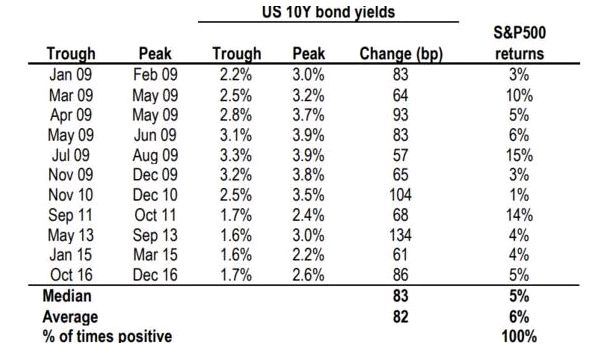 Les dejo un gráfico que muchos inversores apreciarán. Se trata de qué hace el S&P500 cuando los bonos a 10 años suben 50 puntos o más en un mes.