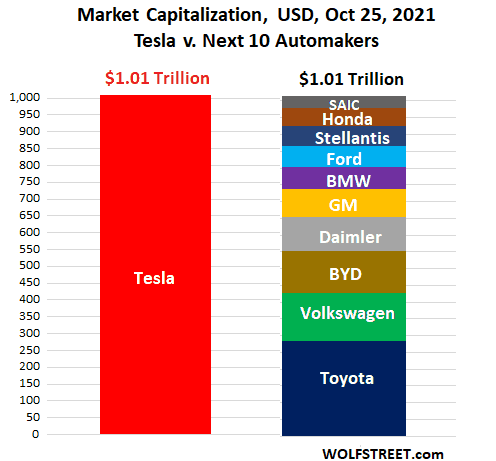 Las acciones de Tesla superaron recientemente la capitalización de mercado de 1,01 billones de dólares. Tesla ahora tiene una relación precio-ganancias de 332, en una industria donde las relaciones de PE de 10 a 30 son típicas en años buenos. Pero Tesla es especial, el CEO Elon Musk camina sobre el agua, y nada ni nadie puede tocarlos, especialmente los reguladores, que son ignorados rutinariamente. Y con esta capitalización de mercado de $ 1.01 billones, Tesla valía tanto como los siguientes 10 fabricantes de automóviles globales más valiosos combinados: Toyota, BYD (China), Volkswagen (VW, Porsche, Audi, Skoda, Seat, etc.), Daimler, GM. , BMW, Ford, Stellantis (incluye FCA), Honda y SAIC Motors (China):