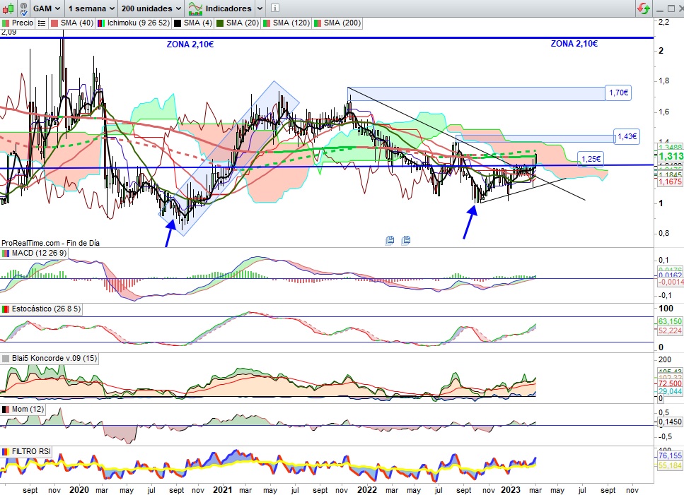 Confirmando dicha perforación en cierre semanal, zona 1,25€, el valor podría disponer ahora indicadores para movimiento sobre las resistencias zona 1,40€, hasta aquí todo fácil, y proyectar el movimiento alcista hacia la cota de los 1,70€, máximos del anterior movimiento alcista a lo largo del 2021.
