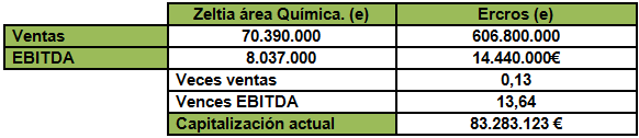 Valor del área química de ZELTIA a múltiplos EBITDA de ERCROS