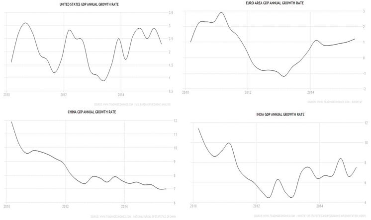 Crecimiento de EEUU, Europa, China e India entre 2010-2015: