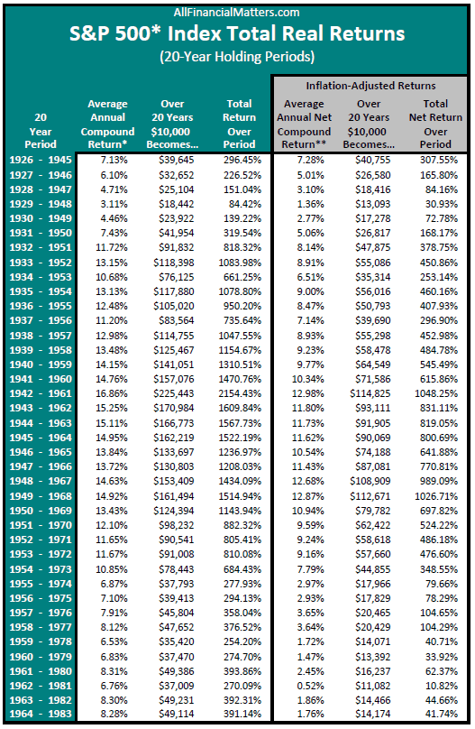 1. Comprar y mantener funciona: Aunque tener el 100% de la cartera invertida en acciones puede ser algo muy perjudicial si compramos en máximos y vendemos en mínimos. Pero si nos fijamos en la rentabilidad total del S&P 500 en los últimos 70 periodos de 20 años (empezando desde 1926-1945 en adelante, 1927-1946, 1928-1947…), vemos que ni uno solo de estos periodos ha tenido rentabilidad negativa.