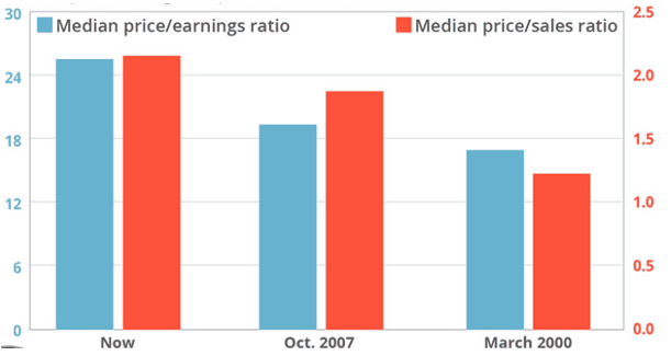 Como vemos en el gráfico adjunto, el precio medio/beneficio se sitúa en la actualidad en el NYSE cerca de 25 frente los 19 de octubre de 2007 y los 17 de marzo de 2000. Por otro lado, el precio medio/ventas ahora está en 2,2 veces, por las 1,8 veces de octubre de 2007 y las 1,25 veces de marzo de 2000.
